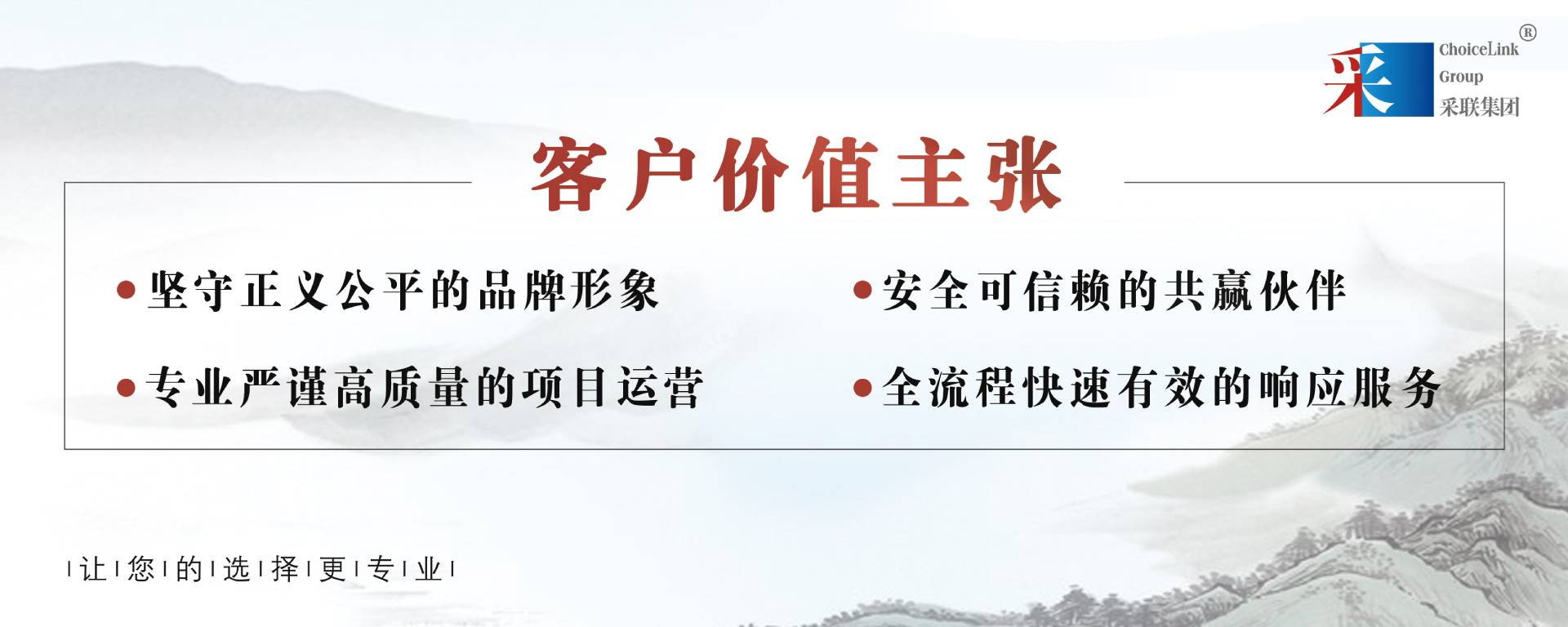 采聯(lián)集團致力于為廣大客戶提供采購全流程專業(yè)服務(wù),堅守“守正出奇”的核心價值觀,以公平公正為原則,不斷優(yōu)化服務(wù)、堅持創(chuàng)新發(fā)展。依托多元化、專業(yè)化的服務(wù),不斷向“締造最具創(chuàng)新力的采購服務(wù)品牌,構(gòu)筑采購領(lǐng)域最專業(yè)的資源交互平臺”的遠大愿景邁進。